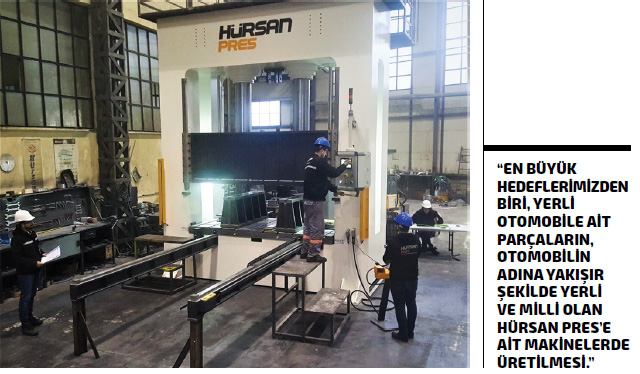 Ar-Ge merkezimiz bugüne kadar otomotiv sektörü başta olmak üzere beyaz eşya, tersane ve ağır üretim tesislerine yönelik çeşitli projeler geliştirdi. Bu projelerin tamamı da kullanıcılarını buldu. Bu, bize amaçlarımızı doğru belirlediğimizi ve Ar-Ge merkezimizi doğru bir şekilde yürüttüğümüzü gösteriyor. Bunların dışında bu yıl içinde sonuçlandırmayı hedeflediğimiz devam eden altı yeni projemiz daha var. Öncelikli hedefimiz bu projeleri tamamlamak. Özellikle TÜBİTAK projesi olarak hazırladığımız servo pres bizim için çok değerli. Sonrasında da yeni projeler ve özgün tasarımlarla yeni teknolojiler geliştirmeye ve mevcut teknolojileri farklı sistemlere entegre etmeye devam edeceğiz. Ülkemiz son yıllarda sanayi alanında önemli atılımlar gerçekleştiriyor. Bunlardan bir tanesi ise yerli otomobil markasının yaratılarak bu alandaki dışa bağımlılığı azaltmak ve sektörde dünya çapında söz sahibi olmak. Bizler de Hürsan Pres ailesi olarak bu çalışmada yer alarak katkı sağlamak istiyoruz. En büyük hedeflerimizden biri, yerli otomobile ait parçaların, otomobilin adına yakışır şekilde yerli ve milli olan Hürsan Pres’e ait makinelerde üretilmesidir.