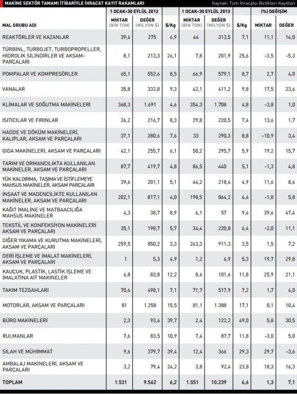 Makine ihracatı 2013 yılı Ocak-Mayıs döneminde yüzde 6 artış göstererek 5,7 milyar dolara yükseldi. Türkiye’nin makine ihracatında ilk 10 ülke sıralamasında 895 milyon dolarlık ihracat değeriyle Almanya ilk sırada yer alırken Almanya’yı sırasıyla İngiltere ve Irak takip ediyor.Makine sektöründe 2013 yılının Ocak-Mayıs döneminde en fazla ihracat klimalar ve soğutma makineleri mal grubunda gerçekleşti. Söz konusu ürün grubunda 2012 yılının Ocak-Mayıs döneminde 927,3 milyon dolar değerinde ürün ihraç edilirken bu rakam 2013 yılının aynı döneminde yüzde 4,3 artış kaydederek 966,8 milyon dolar seviyesine yükseldi. 2013 yılının Ocak-Mayıs döneminde 782,4 milyon dolarlık ihracat gerçekleştirilen motorlar, aksam ve parçaları ürün grubu ise listenin ikinci sırasında yer alıyor. Söz konusu kalemde 2012 yılının aynı döneminde 744,7 milyon dolarlık ürün ihraç edilirken 2013 yılının Ocak-Mayıs döneminde motorlar, aksam ve parçaları mal grubunda yaşanan ihracat artışı yüzde 5 olarak kaydedildi. Listenin üçüncü sırasında bulunan inşaat ve madencilikte kullanılan makineler, aksam ve parçaları ürün grubunda 2012 yılının Ocak-Mayıs döneminde 466,4 milyon dolarlık ihracat gerçekleştirildi. Yüzde 11,3 artışla, söz konusu sektörün 2013 yılının aynı döneminde ihraç ettiği ürünlerin değeri 519,2 milyon dolar seviyesine yükseldi.