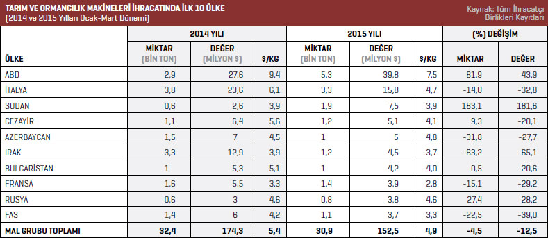2015 yılının Ocak-Mart döneminde Türkiye geneli tarım ve ormancılıkta kullanılan makineler, aksam ve parçaları ürün grubunda ihracat sıralamasında ilk 10 ülke arasında ihracat artışının en fazla yaşandığı ilk üç ülke sıralamasında ise yüzde 181,6 ile Sudan ilk sırada yer alırken yüzde 43,9 ile ABD ikinci ve yüzde 28,2 ihracat artışıyla da Rusya üçüncü oldu.
