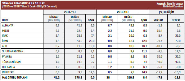 Vanalar ihracatı 2016 yılının Ocak-Eylül döneminde 319,5 milyon dolar olarak kayda geçti. Vanalar sektöründe 2016 yılının Ocak-Eylül döneminde en fazla ihracat gerçekleştirilen ülke 43,8 milyon dolarla Almanya oldu. 2015 yılının aynı döneminde bu rakam 41,3 milyon dolardı.
