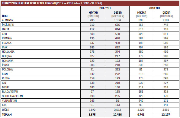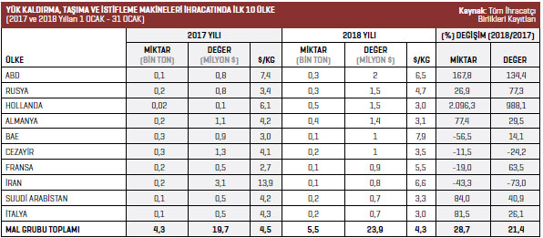 2018 yılının 1-31 Ocak döneminde Türkiye geneli yük kaldırma, taşıma ve istifleme makineleri ürün grubunda en fazla ihracat artışı yüzde 988,1 ile Hollanda’da yaşandı. Söz konusu ülkenin ardından yüzde 134,4 ile ABD gelirken yüzde 77,3 ile Rusya üçüncü sırada yer aldı.