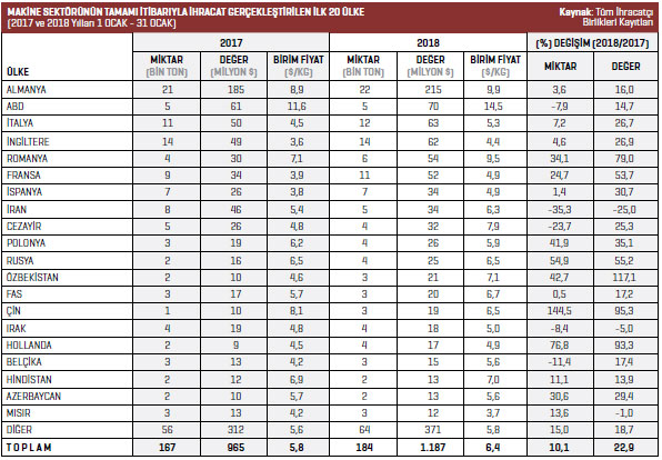 Yük kaldırma, taşıma ve istifleme makineleri ihracatı 2018 yılının 1-31 Ocak döneminde 23,9 milyon dolar olarak kayda geçti. 2017 yılının aynı döneminde bu rakam 19,7 milyon dolardı. Söz konusu ürün grubundaki ihracat artışı yüzde 21,4 olarak kaydedildi.