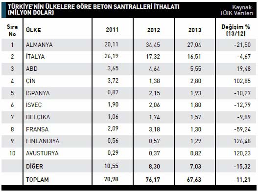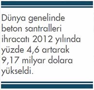 sırasında yer aldı. 2011 yılında 70 milyon dolar değerinde beton santrali ithal eden Türkiye, 2012 yılında yüzde 7,3 artışla 80 milyon dolara yakın ithalat gerçekleştirdi. En fazla beton santrali ithal eden ilk 10 ülke listesinde, 2011 yılına göre ithalatını en fazla artıran ülke ise yüzde 43,7 ile Rusya oldu. Rusya 2011 yılında 240 milyon dolarlık beton santrali ithal ederken bu rakam 2012 yılında 350 milyon dolar seviyesine yükseldi.