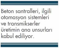 r. Ayrıca beton gibi yapının temel unsuru olan ve yapının sağlamlığıyla doğrudan ilgili bir üründe çeşitli yönetmeliklerle belirlenmiş kalite ve standardın tutturulması yasal bir zorunluluktur. Bütün bunlar sektörde kalite sistemlerinin oluşrurulmasını gündeme getirmiş, kalite denetiminde bulunmak ve sertifika kurallarını tanımlamak üzere sektörel sertifika kurumları kurulmuştur. İngiltere’de Betonarma Çelikleri Sertifika Kurumu (ARES), Hazır Beton Kalite Sistemi (ORMC) bunlardan bazılarıdır. Ülkemizde de hazır beton kalite denetimine yönelik olarak 1995 yılında Türkiye Hazır Beton Birliği Kalite Güvence Sistemi kurulmuştur. Bir hazır beton tesisinde kapasiteyi belirleyen temel üretim unsuru beton santralidir. Beton santraliyle birlikte transmikser ve pompa sayısı kapasite üzerinde kısıt oluşturan diğer üretim unsurlarıdır. Hazır beton, üretimini takiben en çok iki saat içinde kullanılması zorunlu olan bir inşaat malzemesidir. Dolayısıyla inşaat alanı ile beton santrali arasındaki mesafe ve santralden inşaat alanına betonun taşınma kapasitesi, beton santralinin kapasite kullanımını doğrudan etkiliyor. Bu nedenle taze betonun kullanılacağı yere betonun özellikleri bozulmadan taşınabilmesi gerekiyor. Beton taşıması için özel olarak tasarlanmış kamyon benzeri taşıt aracı olan transmikser, bir hazır beton tesisinin en önemli üretim araçlarından birisidir. Eğer santral kapasitesine uyumlu bir taşıma kapasitesi yoksa, santralde üretilen betonun inşaat alanına gerekli sürede taşınması mümkün olmayacağından, santralde beton üretimi taşıma kapasitesiyle sınırlanacaktır. Kapasiteyi etkileyen bir diğer üretim aracı pompa olup, betonun uygulama alanına (kalıba) hızlı bir biçimde aktarılmasını sağlamaktadır. Dolayısıyla pompalı dökümlerde transmikserlerin şantiyelerde bekleme süresi kısalmakta ve daha çok beton taşıma imkanı doğmaktadır. Hazır beton tesisleri ağırlıklı olarak Türkiye’nin batı illerinde kurulmuştur. Nüfus yoğunluğunun fazla olduğu, dış göç alan illerde ihtiyaç duyulan yeni konut ve bu illerde hızlı kentleşmeye bağlı olarak ortaya çıkan altyapı yatırım ihtiyacı, inşaat sektörüne olan talebi artırıyor. Dolayısıyla inşaat sektöründe faaliyet gösteren, inşaat malzemeleri üreten firmalarda bu illerde yoğunlaşıyor.