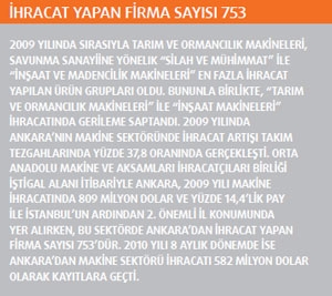 Ankara’nın makine sektöründe ihracat artışı takım tezgahlarında yüzde 37,8 oranında gerçekleşti. Orta Anadolu Makine ve Aksamları İhracatçıları Birliği iştigal alanı itibariyle Ankara, 2009 yılı makine ihracatında 809 milyon dolar ve yüzde 14,4’lik pay ile İstanbul’un ardından 2. önemli il konumunda yer alırken, bu sektörde Ankara’dan ihracat yapan firma sayısı 753’dür. 2010 yılı 8 aylık dönemde ise Ankara’dan makine sektörü ihracatı 582 milyon dolar olarak kayıtlara geçti.