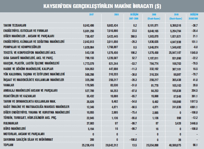 2009 yılı verilerine baktığımızda, Ocak- Kasım aylarını kapsayan sürede Kayseri’nin ihracat alanında yine 2008 yılı rakamları nda olduğu gibi iyi bir noktada olduğu söylenebilir. 2009 yılı Ocak-Kası m döneminde Kayseri’nin genel ihracatı 762 milyon dolar olarak kayıtlara geçiyor. Söz konusu dönemde makine ve aksamları sektörünün genel ihracattan aldığı pay yüzde 6’dır. 2009 yılı Ocak-Kasım döneminde Kayseri’nin makine ve aksamları sektörü ihracatı yüzde 90 oranında artarak 49 milyon dolara yükseliyor. İhracatta ilk sırayı yaklaşık 16 kat artışla 26 milyon dolara yükselen “tekstil ve konfeksiyon makineleri” alıyor. Söz konusu dönemde ihracatı en çok artan diğer ürünler “kâğıt imaline ve matbaacılığa mahsus makineler”, “rulmanlar” ve “tarım ve ormancılık makineleri”dir.