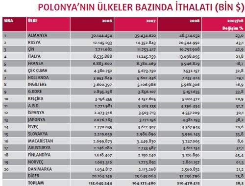 BM verilerine göre; bir önceki yıla kıyasla Polonya’nın ihracatı yüzde 35,2 azalarak 2009 yılında 111,4 milyar dolar oldu. Almanya, Fransa ve İtalya, 2008 yılında ülkenin genel ihracatında en çok payı alan ilk üç ülke olarak kayıtlara geçti. Polonya’nın önemli ihraç ürünleri “makine ve aksamları”, “Demiryolu harici karayolu taşıtları ve aksamları” ve “elektrikli makine ve cihazlar” dır.Makine ve aksamları ürün grubunun Polonya’nın toplam ihracatındaki payı yüzde 14,8 olarak belirlendi. Polonya’nın ithalatı yüzde 31,3 azalarak 2009 yılında 144,6 milyar dolara ulaştı. Ülkenin genel ithalatında en çok payı alan ilk üç ülke sırasıyla Almanya, Rusya ve Çin oldu. Önemli ithal kalemleri ise “makine ve aksamları”, “mineral yakıt ve yağlar, mumlar” ile “elektrikli makine ve cihazlar” olarak kayıtlarda yer aldı. Ülkenin genel ithalatında makine ve aksamlarınınpayı yüzde 13,9 seviyesinde bulunuyor.