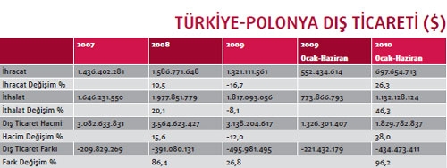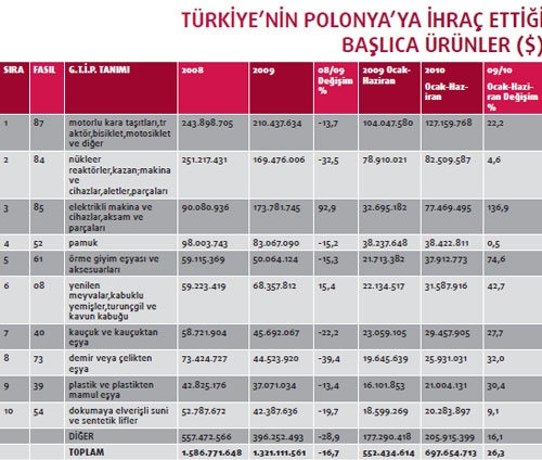 Türkiye ve Polonya büyük ölçüde benzer malların üretimini ve ihracını yapıyor. İki ülke arasındaki cari mal ticareti ağırlıklı olarak elektronik ve otomotiv sektörlerinde girdi tedariğine yönelik seyrediyor.İçinde bulunduğumuz dönemde küresel krize bağlı olarak başta AB üyesi ülkeler olmak üzere her iki ülkenin de dış pazarlarının daralması, bu şekilde yapılan ticareti olumsuz etkiledi. Türkiye Polonya’ya otomotiv sanayi ürünleri (binek otomobiller ve yedekparça), tekstil ve konfeksiyon,makine ve aksamı, dayanıklı tüketimmalları, taze sebze ve meyve, fındıkihraç ederken Polonya’dan daha çokelektronik aksam ve otomotiv sanayiiürünleri ithal ediyor. 2009 yılındaPolonya’ya ihracatımız yüzde16,7 azalırken, ithalatımız da yüzde8,1 oranında geriledi. 2010 yılı Ocak-Haziran döneminde ise; bir önceki yılaynı dönemine göre ihracatımız yüzde26,3, ithalatımız ise yüzde 46,3yükselme gösterdi. Polonya ile dış ticaretimizsöz konusu ülke lehine fazlavermekte olup, 2009 yılında 496 milyondolar oldu. 2010 yılı ilk yarısındadış ticaret hacminde kaydedilen yüzde38 oranında büyüme rakamı, küreselkriz nedeniyle 2009 yılında ikiülke arasında dış ticarette yaşanangerilemenin 2010 yılında hızlı bir şekildetelafi edileceğini işaret ediyor.İki ülke arasında dış ticaretin dahayakından incelenmesi amacıylafasıl bazında verilere bakıldığında;2010 yılı Ocak-Haziran dönemindeTürkiye’nin Polonya’ya yaptığı toplamihracat içinde en büyük paya sahipolan ürün grubunun 127 milyon dolarile “motorlu kara taşıtları, traktör,bisiklet, motosiklet ve diğer” olduğugörülüyor. Bu ürün grubunu, “makineve aksamları” ile “elektrikli makine vecihazlar, aksam ve parçaları” izledi.2010 yılı Ocak-Haziran dönemindeTürkiye’nin Polonya’dan yaptığı toplamithalat içinde en büyük paya sahipolan ürün grubu “makine ve aksamları”olarak kayıtlara geçti. Buürün grubunu “elektrikli makine ve cihazlar,aksam ve parçaları” ve “motorlukara taşıtları, traktör, bisiklet,motosiklet ve diğer” izliyor.