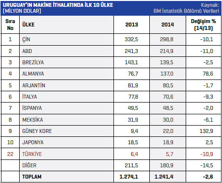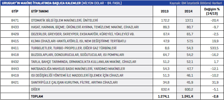 Birleşmiş Milletler (BM) İstatistik Bölümü verileri, Uruguay’ın 2013 yılında 29,7 milyon dolar olan makine ihracatının, 2014 yılında yüzde 15,8’lik düşüşle 25 milyon dolara gerilediğini gösteriyor.