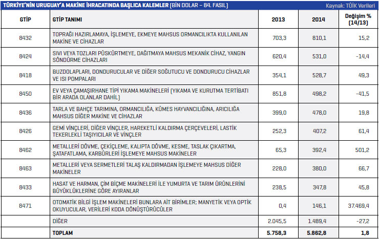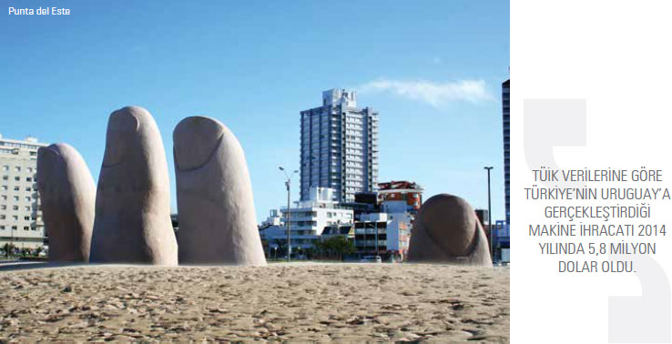 Ülkenin ihracatta gözde pazarlarından biri olan Brezilya, makine ihracatında da listenin başında yer alıyor. 2014 yılında Brezilya’ya gerçekleştirdiği makine ihracatında bir önceki yıla kıyasla neredeyse yüzde 100’lük artış kaydeden Uruguay, 2013 rakamlarında 3 milyon dolar olan ihracatını 2014’te 5,9 milyon dolara çıkardı.