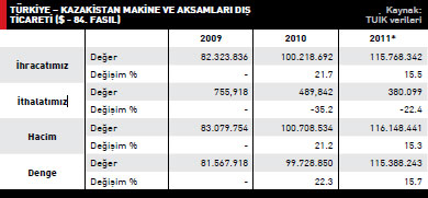 Makine ve aksamları sektöründe, ülkemiz ile Kazakistan arasındaki dış ticaret dengesi 2011 yılında bir önceki yıla göre yüzde 16 oranında artış gösterdi. 2011 yılında bu değer 115 milyon dolar düzeyinde gerçekleşti. İki ülke arasındaki dış ticaret hacmi 2010 yılına göre yüzde 15 artarak yaklaşık 116 milyon dolar olarak kaydedildi.