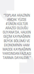 Toplam arazinin ancak yüzde 4’ünün kültür arazisi olduğu Guyana’da, halkın geçim kaynağının büyük bölümü ve ekonominin ham madde kaynağının yarısından fazlası tarıma dayalıdır. Tarım için en elverişli bölgeler, kıyıdaki alüvyon ve nehir kenarlarındaki sulak ovalarken, Guyana’da üretim sezonu Nisan- Ağustos ve Ekim-Ocak ayları arasıdır. Tarım üretiminin büyük bölümü şeker ve pirinçten oluşurken, ülkenin yüzde 8,7’si ormanlarla kaplı olmasına rağmen ülkede orman ürünleri sektörünün gelişimi oldukça ağır ilerliyor.