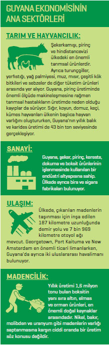 Ülke ekonomisinde en büyük pay sahibi ise boksit, alüminyum, manganez, altın ve elmas üretimidir. Öte yandan nebati yağ, şeker, sigara ve ilaç da önemli sanayi kalemleri arasındadır. Eski bir İngiliz sömürgesi ve Commonwealth of Nations üyesi olması nedeniyle dış ticaret alanı kısıtlı olan ülkenin en önemli ticari partnerleri Kanada ve İngiltere’dir. Guyana’nın en önemli ihraç ürünleriyse şeker, boksit, pirinç, kereste, elmas ve altındır. Makine, işlenmiş gıda maddesi, petrol ürünleri ise en önemli ithalat kalemleridir. Guyana’nın ihracat ve ithalatı büyük oranda başkent Georgetown’dan deniz yoluyla yapılırken, ulaşım sisteminde demir yolu taşımacılığı ayrıcalıklıdır. Kıyı şehirleri arasında ve büyük nehirlerde ise yaygın olarak gemi taşımacılığı kullanılıyor.