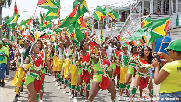 Denizaşırı seferlerde üs olarak kullanılabilmesi ve birçok yere uygun ulaşım şartlarına sahip olması sebebiyle tarih boyunca çeşitli istilalara maruz kalan; değişik zamanlarda İspanyol, Hollanda ve İngiliz işgali altına giren ülkenin devlet olarak tarihi, 1831’de Demerara, Essoquibo ve Berbice bölgelerinin birleşerek Guyana’yı oluşturmasıyla başlıyor. 1834’e kadar nüfusunu sadece İngiliz ve yerlilerin meydana getirdiği bir devlet olan Guyana’ya, bu tarihte 240 bin civarında tarım işçisi de getirilmiş. Bundan sonraki iki yüzyıl sosyoekonomik bakımdan zayıf bir İngiliz sömürgesi olarak var olan Guyana, Birinci ve İkinci Dünya Savaşları’ndan fiili olarak etkilenmese de gelişimi daha da yavaşlamış. 1953’te İngiltere’nin yardımıyla hızlı bir gelişme dönemine giren ülkede iki parti arasındaki rekabet ise İngilizlerin Guyana’ya tam bağımsızlık vermesini geciktiren en önemli etken olarak gösteriliyor. Guyana ancak 26 Mayıs 1966’da İngiliz Milletler Topluluğu (Commonwealth of Nations) üyesi bir devlet olarak bağımsızlığına kavuşurken, Guyana’yı meydana getiren üç devlet, iç işlerinde hükümete bağlı olarak, bugün de ülke yönetiminde ayrı eyaletler statüsünde varlığını sürdürüyor. Guyana, fiziki özellikleri bakımdan kıyı, orman ve savana olmak üzere üç bölgeye ayrılıyor. Kıyılar denizden itibaren 10-60 kilometre genişliğinde bir şerit ve denizden birkaç yüz metrelik irtifada olan alçak alanlarken, kıyı kısımları bu özelliği nedeniyle özel bant ve bariyerlerle korunuyor. Bu bölgeden iç kısımlara doğru gidildikçe ormanların başladığı ülkede bol yağış alan bu alanlar