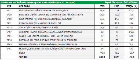 Guyana, 2016 yılında en fazla ağır iş makine ve cihazlarının aksam ve parçaları kaleminde ürün ithal etti. 2015 yılında söz konusu ürün grubunda 38,2 milyon dolarlık ithalat gerçekleştirilirken, 2016 yılında bu rakam yüzde 203 artarak 115,8 milyon dolar olarak kayda geçti. Listenin ikinci sırasında dozerler, greyder, skreyper, ekskavatör, küreyici, yükleyici kalemi bulunuyor. Guyana 2015 yılında söz konusu kalemde 25,6 milyon dolar değerinde makine ithal ederken, 2016 yılında bu rakam yüzde 15,5 artışla 29,6 milyon dolar oldu. Guyana’nın en fazla ithalat gerçekleştirdiği üçüncü kalem içten yanmalı, pistonlu motorların aksamparçaları oldu. 2015 yılında söz konusu ürün grubunda 11,7 milyon dolarlık ithalat gerçekleştirilirken, 2016 yılında bu rakam yüzde 20,4 artarak 14,1 milyon dolar oldu.