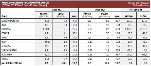 Ambalaj makineleri ürün grubunda 2016 yılının Ocak-Nisan döneminde 46,7 milyon dolarlık ihracat gerçekleştirildi. 2015 yılının aynı döneminde bu rakam 45,1 milyon dolardı.