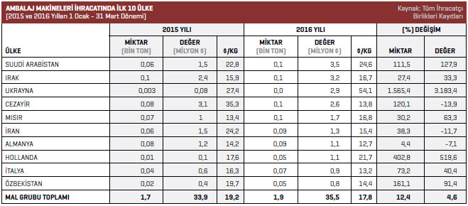 Ambalaj makineleri ürün grubunda 2015 yılının Ocak- Mart döneminde 33,9 milyon dolarlık ihracat gerçekleştirilirken bu rakam, 2016 yılının aynı döneminde yüzde 4,6 artışla 35,5 milyon dolar olarak kaydedildi.