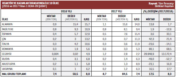 2017 yılının Ocak-Şubat döneminde Türkiye geneli reaktör ve kazanlar sektöründe en fazla ihracat artışı yüzde 13.172,4 ile Cezayir’de yaşandı. Bu ülkenin ardından yüzde 68,5 ile Romanya ikinci sırada gelirken yüzde 33,1 ile İspanya üçüncü sırada yer aldı.