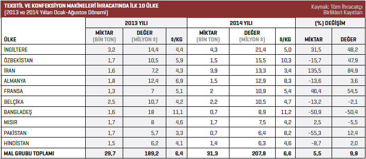 Tekstil ve konfeksiyon makineleri ürün grubu ihracatı 2014 yılının Ocak-Ağustos döneminde, 2013 yılının aynı dönemine göre yüzde 9,8 artış göstererek 207,8 milyon dolar değerine ulaştı. Tekstil ve konfeksiyon makineleri mal grubunda 2013 yılının Ocak-Ağustos döneminde ihraç edilen ürünlerin değeri ise 189,2 milyon dolar seviyesindeydi. Tekstil ve konfeksiyon makineleri sektöründe 2014 yılının Ocak-Ağustos döneminde en fazla ihracat gerçekleştirilen ülke 21,4 milyon dolarla İngiltere oldu. Yüzde 48,2 artışın yaşandığı söz konusu ülkeye, 2013 yılının aynı döneminde 14,4 milyon dolar değerinde ürün ihraç edilmişti. Listenin ikinci sırasında bulunan Özbekistan’a 2014 yılının Ocak-Ağustos döneminde 15,5 milyon dolarlık ihracat gerçekleştirildi. 2013 yılının aynı döneminde bu rakam 10,5 milyon dolar seviyesindeydi. Özbekistan’a yönelik ihracat artışı yüzde 47,9 olarak kaydedildi. Listenin üçüncü sırasında yer alan İran’a yönelik tekstil ve konfeksiyon makineleri ihracatı 2014 yılının Ocak-Ağustos döneminde, geçen yılın aynı dönemine göre yüzde 84,9 artış gösterdi. 2013 yılının Ocak-Ağustos döneminde 7,2 milyon dolarlık ürün gönderilen İran’a, 2014 yılının aynı döneminde ihraç edilen ürünlerin değeri 13,3 milyon dolara yükseldi. Dördüncü sıradaki Almanya’ya 2013 yılının Ocak-Ağustos döneminde 12,4 milyon dolarlık tekstil ve konfeksiyon makinesi ihraç edilirken 2014 yılının aynı döneminde bu rakam yüzde 3,6 artışla 12,9 milyon dolar oldu. Listenin beşinci sırasında yer alan Fransa’ya 2014 yılının Ocak-Ağustos döneminde 10,9 milyon dolar değerinde ihracat gerçekleştirildi. 2013 yılının aynı döneminde bu rakam 7 milyon dolar seviyesindeydi. Fransa’ya yönelik ihracat artışı yüzde 54,5 oldu.
