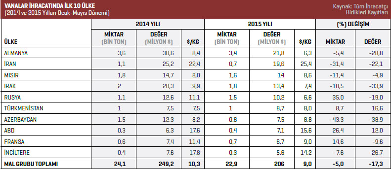 Vanalar ihracatı 2015 yılının Ocak-Mayıs döneminde 206 milyon dolar olarak kayda geçti.