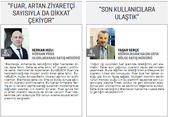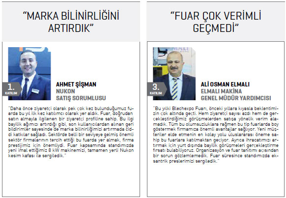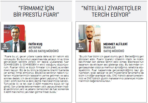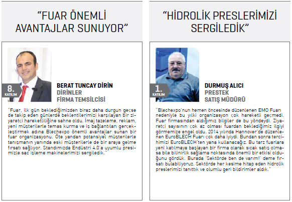 Endüstriyel tasarım ve üretimde yaygın olarak kullanılan bu ürünün üretildiği sac işleme makineleri, sanayi üretiminin de en temel bileşenlerinden biri. Türkiye’nin Makinecileri olarak ihraç ettiğimiz sac işleme makinelerinde üretilen levhalar; demir- çelikten inşaata, beyaz eşyadan otomotive dek dünya genelinde tüm sanayi kollarında kullanılıyor.” Türkiye’nin Makinecileri dört gün süren fuar boyunca sektörün tanıtımına yönelik etkin bir faaliyet yürüttü.