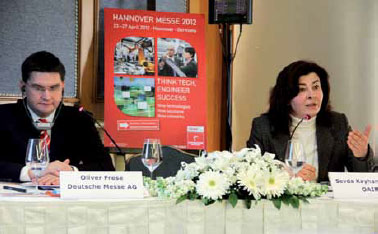 Hannover Messe 2012 fuarı için (23-27 Nisan’da düzenlenecek) Deutsche Messe AG Başkan Yardımcısı Oliver Frese ile Makine ve Aksamları İhracatçıları Birliği Yönetim Kurulu Üyesi Sevda Kayhan Yılmaz 22 Şubat tarihinde İstanbul’da gerçekleştirilen basın toplantısı ile katılımcılara fuar hakkında bilgi verdiler.
