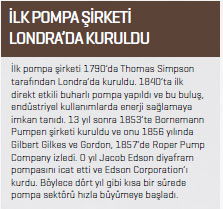 Hızla gelişen pompa teknolojileri alanında yenilikler birbiri ardına gelmeye devam etti ve nihayet ilk pompa şirketi 1790’da Thomas Simpson tarafından Londra’da kurdu. Simpson’ın girişiminin ardından farklı isimler yeniliklere imza atmaya ve yeni şirketler kurmaya devam etti. Modern vidalı pompa, 1830’da Revillion tarafından yaratıldı. 1840’ta ilk direkt etkili buharlı pompa yapıldı ve bu buluş, endüstriyel kullanımlarda enerji sağlamaya imkan tanıdı. 13 yıl sonra 1853’te Bornemann Pumpen şirketi kuruldu ve onu 1856 yılında Gilbert Gilkes ve Gordon, 1857’de Roper Pump Company izledi. O yıl Jacob Edson diyafram pompasını icat etti ve Edson Corporation’ı kurdu. Böylece dört yıl gibi kısa bir sürede pompa sektörü hızla büyümeye başladı. Sonraki yıllar, 1945’te Grundfos da dahil olmak üzere yeni şirketlerin hızla kurulduğu bir dönem oldu. 1948’e kadar ciddi ilerlemeler yaşanmaya devam etti ve aynı yıl Stenberg-Flygt AB şirketinin tasarladığı ilk dalgıç drenaj pompası, bir yıl sonra da HMD tarafından yaratılan mıknatıslı pompa, sektörde çığır açtı. Sonraki yıllar pompa endüstrisinde yenilikler yaşanmaya ve yeni buluşlarla birlikte yeni şirketler de açılmaya devam etti. Bugün pompa sektörü dünyanın en büyük pazarlarından birini oluşturuyor ve sektörde her geçen gün yeniliklere imza atılmaya devam ediliyor.