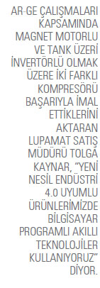 Basınçlı hava sektöründe 50 yıldır faaliyet gösteren Lupamat, 1968 yılında pistonlu kompresör imalatına başladı. İlerleyen yıllarda ürün yelpazesine vidalı, yağsız çalışan pistonlu, booster, scroll, benzinli ve son olarak da 40 bar yüksek basınç kompresörleri ekleyen firma, 2000 yılında Dirinler Şirketler Grubu’na katıldı. Gelişen teknolojiyi yakından takip ederek enerji verimliliği konusunda çalışmalar gerçekleştiren firmalarının ürün çeşitliliğinin de sürekli arttığını söyleyen Lupamat Satış Müdürü Tolga Kaynar, Ar-Ge birimlerinin aralıksız şekilde hem iyileştirme hem de pazarın ihtiyacı olan yeni ürünleri geliştirme çalışmalarını sürdürdüğünü kaydediyor.