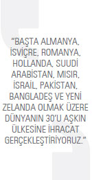 Firmamız, başta Almanya, İsviçre, Romanya, Hollanda, Suudi Arabistan, Mısır, İsrail, Pakistan, Bangladeş ve Yeni Zelanda olmak üzere dünyanın 30’u aşkın ülkesine ihracat gerçekleştiriyor. Öte yandan 13 ülkede de bayiliklerimiz mevcut. Yeni pazar araştırmalarımızı ise büyük bir hızla sürdürüyoruz.