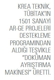 Krea Teknik, TÜBİTAK’tan 1501 Sanayi Ar-Ge Projeleri Destekleme Programı kapsamında aldığı teşvikle ufak boyutlu ürünlerin ayrıştırılarak taşınmasını sağlayan makine geliştirdi. Standart ve karmaşık şekilli ürünlerin daha rahat ayrıştırılması için geliştirilen makine; doküman, kitap ve broşür gibi daha hafif ürünler için de hizmet sunabiliyor. Saatte 6 bin adet ayrıştırma yapabilen makinenin, modüler yapıya sahip olması sayesinde istasyon sayıları