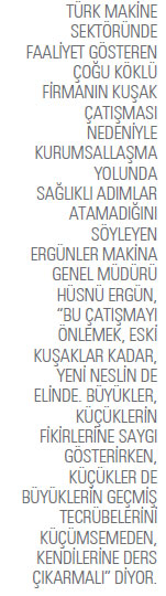 55 yıla yaklaşan geçmişe sahip firmamızın devamlılığını sağlamak adına üçüncü kuşak olarak bizlerin de elimizi taşın altına sokmamız ve firmayı daha yukarılara taşımak için işimizi omuzlamamız gerektiğini düşünüyorum. Bu açıdan bakıldığında Ergünler Makina’da görev almak benim için bir zorunluluktu. Çocukluk döneminden itibaren içinde olduğum için hemen hemen işin her yönü ve ürettiğimiz makinelerin kullanım alanlarıyla ilgili bilgi ve donanıma sahibim. Dolayısıyla bu noktadan sonra dışarıya bağımlılığınız kalmıyor. Destek almak zorunda kalmıyor, hamlelerinizi daha hızlı yapıp, sonuca daha çabuk ulaşabiliyorsunuz.