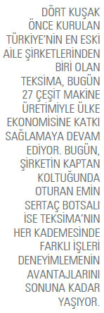 Türkiye’nin en eski aile şirketleri arasında yer alan ve dört kuşak önce, 1893 yılında, Mehmet Emin Botsalı’nın iplik ticaretine başlamasıyla temelleri atılan Teksima Tekstil Makine Sanayi, bugün Emin Sertaç Botsalı’nın yönetiminde ülke ekonomisine dördüncü kuşak olarak da katkı sağlamaya devam ediyor. Aile şirketlerinde geleneksel yönetim tarzını, kurumsallaşmayla birleştirerek ortaya çıkan sinerjiyi dördüncü kuşağa taşımayı başaran firma, genel kabul olarak görülen “ilk kuşak şirketi kurar, ikinci kuşak büyütür, üçüncü kuşak batırır” yaklaşımını, aşmanın faydalarını görüyor. 1938 yılında şirketin kurucusu Mehmet Emin Botsalı’nın hayatını kaybetmesiyle, ikinci kuşak yönetimi devralıyor. Hasan ve Hüseyin Botsalı kardeşlerin yönetiminde firma, 1980’li yıllara kadar büyümesini ve gelişimini sürdürüyor. Üçüncü kuşak da aynı yıllarda şirket yönetimini üstleniyor. Mehmet İsmet Botsalı, Hasan ve Hüseyin Botsalı’nın vefatından sonra şirketi, 80’li yılların Türkiye’sinde serbest piyasa ekonomisine geçişin sancıları içinde başarıyla yönetiyor. 1970’li yıllarda iplik ticaretinden iplik imalatına yönelen firma Mehmet İsmet Botsalı’nın üçüncü kuşak olarak yönetime geçmesiyle tekstil makineleri üretimine başlıyor. Üçüncü kuşakla birlikte Teksima’da yeni bir dönem de başlamış oluyor.