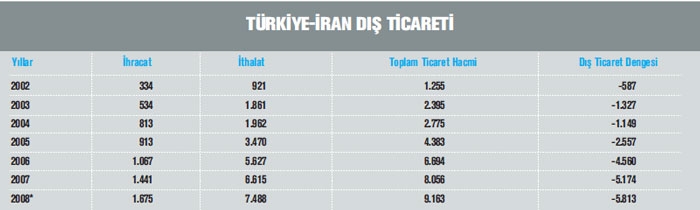 Türkiye ile İran arasındaki ticaret rakamlar incelendiğinde 2002 yılında 1,3 milyar dolar olan toplam dış ticaret hacmi yüzde 542 oranında artış kaydederek 2007 yılında 8,1 milyar dolara ulaşmış. 2007 yılında 1,4 milyar dolar olan ihracatımız 2008 yılı- nın Ekim ayı itibariyle 1,7 milyar dolar olarak gerçekleşmiş. İthalatımız ise 2007 yılında 6,6 milyar dolar iken 2008 yılının Ekim ayı itibariyle 7,5 milyar dolar olarak kaydedilmiş. İki ülke arasındaki dış ticaret 2002 yı- lında 587 milyon dolar, 2003 yılında 1.327 milyon dolar, 2004 yılında ise 1.149 milyon dolar Türkiye aleyhine açık vermiş olup, söz konusu dış ticaret dengesi 2005, 2006 ve 2007 yılları nda da açık vererek, 2008 yılının Ekim ayı itibariyle 5,8 milyar dolar ile Türkiye aleyhine açık vermiş. İki ülke arasında dış ticaretin daha yakından incelenmesi amacıyla mal grupları bazında verilere bakıldığında; 2007 yılında Türkiye’nin İran’a yaptığı toplam ihracat içinde en büyük paya sahip olan ürün 211 milyon dolar ile makine ve aksamları alıyor. Onu 152,7 milyon dolarla demir ve çelik takip etmiş. Ağaç ve ahşap eşya, odun kömürü ve elektrikli makine ve cihazlar, aksam ve parçaları da ihracattan büyük pay alan mal grupları arasında. 2007 yılında Türkiye’nin İran’dan ithalatı nda fasıl olarak birinci sırayı 6 milyar dolarlık değeriyle benzin motor yağları, fuel oil, nafta, etilen, propilen ve benzin almış. Onu sırasıyla bakır ve bakırdan eşya, plastik ve mamulleri, demir ve çelik takip ediyor. SPOT: “ 2007 yılında İran’ın en fazla ithal ettiği ürünlerin makine ve aksamları olduğu görülüyor. Söz konusu faslın toplam ithalattan aldığı pay yüzde 13,5 olup, toplam 7,75 milyar dolar değerinde ithalat gerçekleştirilmiş. ”