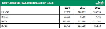 Türkiye ile Kongo arasındaki ticari ilişkiler, genellikle potansiyelinden uzakta seyrediyor. TÜİK verilerine göre 2000 yılında 4 milyon dolar olan iki ülke arasındaki dış ticaret hacmi yıllar içinde düzenli bir yükseliş grafiği sergileyerek, 2005 yılında 29,5 milyon dolara, 2010’da 56,6 milyon dolara ve 2014’te en yüksek düzeyine ulaşarak 181,5 milyon dolara ulaştı. Son iki yıldır azalan bir grafiğe dönüşüyor olsa da iki ülke arasında geçtiğimiz yıl 111,1 milyon dolarlık dış ticaret gerçekleşti.