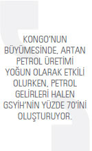 Diğer yandan Kongo’da nüfusun yüzde 70’i halen kırsal bölgelerde yaşıyor ve düşük-orta gelir sınıfında yer alıyor. Ülkedeki siyasi istikrarın sağlanmasını takip eden yıllarda, 2010’da yüzde 8,8, 2011’de yüzde 5,1’lik büyüme oranları yakalayan Kongo’nun güncel büyüme beklentisi yüzde 3 olarak açıklanıyor. Büyümede, artan petrol üretimi yoğun olarak etkili olurken, petrol gelirleri halen GSYİH’nin yüzde 70’ini, ihracatın ise yüzde 80’den fazlasını oluşturmaya devam ediyor. Petrolden elde edilen gelir ise ülkenin zayıf tarım politikaları nedeniyle başta tahıl, et, şeker ve yağ gibi temel gıda maddeleri ile ihtiyaç duyduğu sanayi girdilerine harcanıyor. Kongo, petrol yağ ve gazları, bakır ve kalay gibi maden cevherleri ile ağaç ürünleri ihraç ederken, yoğun olarak Çin, İtalya, Gabon, Angola, ABD, Hindistan, Portekiz, İspanya, Fransa, Endonezya, Avustralya ve Tayland ile dış ticaretini sürdürüyor.