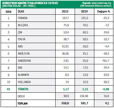 partnerleri olurken, Türkiye, Kongo’nun makine ithalatı gerçekleştirdiği ülkeler içerisinde ancak 31’inci sırada yer aldı. Bu dönemde, BM İstatistik Bölümü verilerine göre Türkiye’den Kongo’ya 1,11 milyon dolar değerinde makine ihraç edildi. TÜİK verilerine göre ise 2014’te 3,7 milyon dolar olan bu ihracat, 2015’te yüzde 119 artış gösterdi ve 8,2 milyon dolara yükseldi.