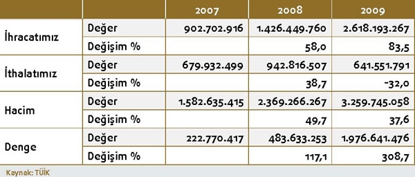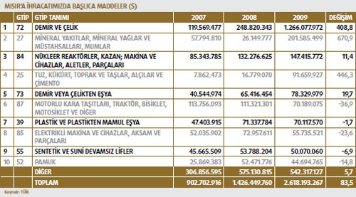 Mısır’a yönelik ihracatımız 2009 yılında yüzde 83,5 artarak 2 milyar 618 milyon dolar olarak gerçekleşti. Söz konusu ülkeye ihracatını gerçekleştirdiğimiz ilk 10 madde arasında yüzde 670,9 ile “Mineral Yakıtlar, Mineral Yağlar ve Müstahsalları”, yüzde 446,3 ile “Tuz, Kükürt, Toprak ve Taşlar, Alçılar ve Çimento” ve yüzde 408,8 ile “demir ve çelik” grupları geliyor. Mal gruplarında yaşanan ihracat artış oranı dikkat çekiyor. “Makine ve aksamları” 2009 yılında Mısır’a ihracatımızda 3. sırada yer aldı. Mısır’dan ithalatımız 2009 yılında yüzde 32 gerileyerek 641,5 milyon dolar seviyesinde gerçekleşti. Mısır’dan ithal ettiğimiz ilk 10 kalem arasında ithalatında artış görülen kalemler “hububat”, “dokumaya elverişli suni ve sentetik lifler”, “sentetik ve suni devamsız lifler”