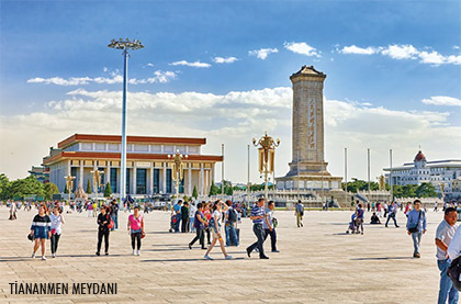 Tiananmen Meydanı, dünyanın en büyük meydanı ve Pekin’in merkezi olarak kabul ediliyor. En çok 1989 olayları nedeniyle bilinen meydan, günümüzde de turistik bir alan olarak oldukça kalabalık olsa da halen Çin güvenlik güçleri tarafından sıkı şekilde kontrol ediliyor. Tiananmen Kapısı, meydanı Yasak Şehir’e bağlarken, Çin Ulusal Müzesi de bu meydanda yer alıyor. 1651’de inşa edilen ve zamanla genişletilerek günümüzdeki boyutlarına ulaşan meydan, inşa edildiği tarihten bu yana Afyon Savaşları, 4 Mayıs Hareketi, 1976 ve 1989 Olayları gibi Çin tarihini derinden etkileyen olaylara tanıklık etmesiyle tarihsel bir önem taşıyor. Meydanın çevresindeki önemli binalar ise Çin Tarihi Müzesi, Çin Devrimi Müzesi ve Yasak Şehir olarak sayılabilir. Ayrıca Halk Binası, Halk Kahramanları Anıtı ve Tiananmen Kulesi de meydanın dikkat çeken eserleridir.