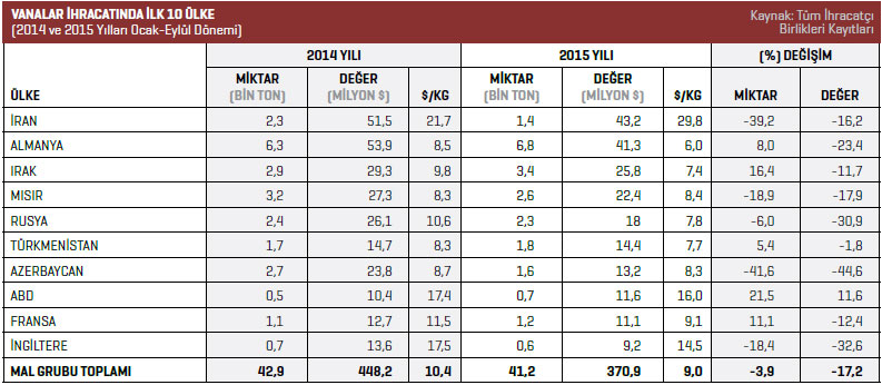 Vanalar ihracatı 2015 yılının Ocak-Eylül döneminde 370,9 milyon dolar olarak kayda geçti.