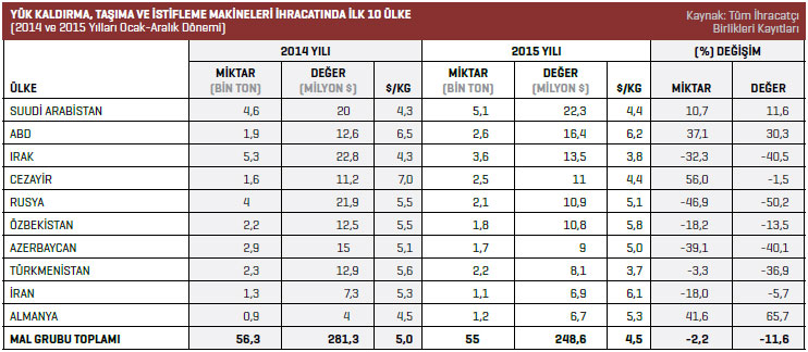 Yük kaldırma, taşıma ve istifleme makineleri ürün grubunda 2015 yılının Ocak- Aralık döneminde 22,3 milyon dolarla en fazla Suudi Arabistan’a ihracat gerçekleştirildi. Söz konusu ülkeye 2014’te ihraç edilen ürünlerin değeri 20 milyon dolardı. 2015 yılında kaydedilen 22,3 milyon dolarlık ihracatla Suudi Arabistan’a yönelik ihracatta yüzde 11,6’lık artış yaşanmış oldu. Listenin ikinci sırasında bulunan ABD’ye 2014’ün Ocak- Aralık döneminde 12,6 milyon dolarlık ihracat gerçekleştirilirken 2015’te bu rakam yüzde 30,3 artışla 16,4 milyon dolar oldu. Listenin üçüncü sırasında bulunan Irak’a 2015 yılı süresince 13,5 milyon dolarlık ihracat gerçekleştirildi. Dördüncü sırada yer alan Cezayir’e 2015 Ocak- Aralık döneminde 11 milyon dolarlık ihracat gerçekleştirildi. Beşinci sıradaki Rusya’ya 2015 yılı boyunca ihraç edilen yük kaldırma, taşıma ve istifleme makinelerinin değeri 10,9 milyon dolar oldu.