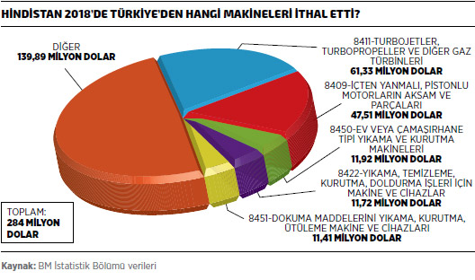 Türk makine ihracatçıları ise Hindistan’a 2018’de en çok 8411 GTİP kodlu Turbojetler, turbopropeller ve diğer gaz türbinleri” ürün grubunda ihracat yaptı. Bu ürün grubundaki ihracatın değeri 2018’de 61,33 milyon dolar olarak kayda geçerken, listenin ikinci sırasında yüzde 81,9 artış ve 47,51 milyon dolarlık ihracatla 8409 GTİP kodlu “İçten yanmalı, pistonlu motorların aksam ve parçaları” ürün grubu bulunuyor. Hindistan’a 2018’de en fazla ihracat gerçekleştirdiğimiz üçüncü kalem ise yüzde 17,4 azalış ve 11,92 milyon dolarla 8450 GTİP kodlu “Ev veya çamaşırhane tipi yıkama ve kurutma makineleri” oldu.