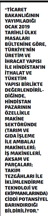 Bu veriler ışığında, Hindistan’ın 2018’de gerçekleştirdiği 323 milyar dolarlık toplam ihracatı içerisinde makine ihracatının yüzde 7,18 pay aldığı söylenebilir. 2017’de bu oranın yüzde 6,42 olduğu da değerlendirildiğinde, Hindistan makine imalat sanayisinin ülke GSYİH’si içindeki payını arttırıyor olması da dikkat çekiyor.