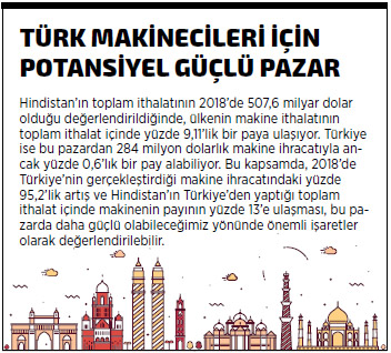 Bu çerçevede, BM İstatistik Bölümü verilerine göre Hindistan’ın makine ihracatı, 2018’de yüzde 22,1 artışla 23,2 milyar dolar olarak kayda geçerken, ülke yüzde 33,8’lik artış ve 4,36 milyar dolarla en fazla ABD’ye makine ihraç etti. Hindistan’ın 2018’de en fazla makine ihraç ettiği ikinci ülke yüzde 33’lük artış ve 1,69 milyar dolarla Almanya oldu. Üçüncü sırada bulunan İngiltere’ye 2018’de yüzde 16 oranında artışla 1,11 milyar dolarlık makine ihraç edilirken, dördüncü sıradaki Çin’e ihraç edilen makinelerin değeri yüzde 23,4’lük artışla 897 milyon dolar oldu. 2018’de Türkiye, Hindistan’dan gerçekleşen makine ihracatında 13’üncü sırada yer aldı ve toplamda 524 milyon dolar değerinde makine ithal etti. Bu dönemde Türkiye’nin Hindistan’dan gerçekleştirdiği makine ithalatı ise yüzde 8,3 azaldı.