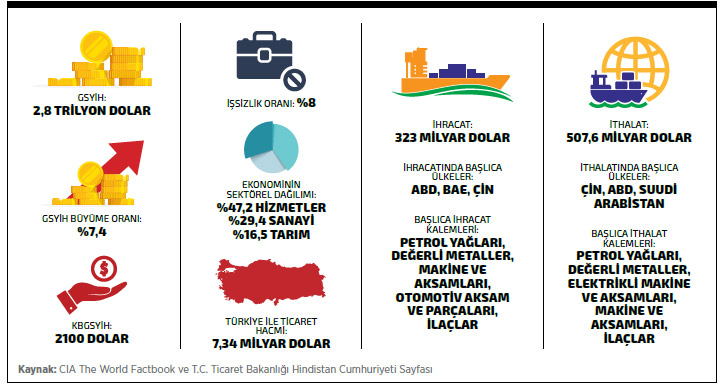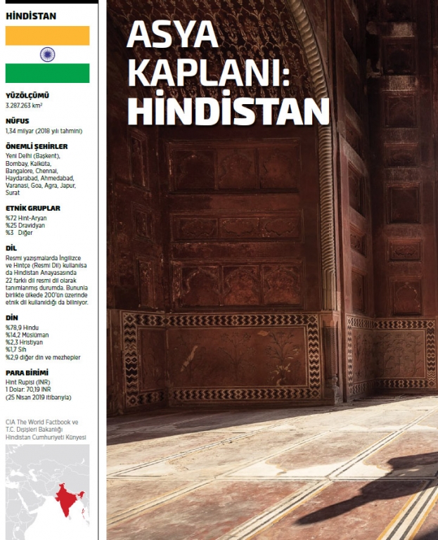 Asya’nın hem ekonomik, hem siyasi hem de kültürel anlamda en güçlü ülkelerinden olan Hindistan, son 20 yıldır aralıksız büyüyor. Çin’den sonraki en güçlü nüfus yoğunluğuyla aynı zamanda dünyanın en önemli tüketim merkezlerinden biri olan Hindistan, tek haneli ilerleyen işsizlik ve enflasyon verileriyle de geleceğe yönelik olumlu beklentileri karşılamaya devam ediyor. Son beş yıl verileri incelendiğinde dünya çapında en güçlü büyüme sergileyen ülke olan Hindistan’ın imalat sanayisi de bu dönemde yüzde 9,5 güçlenmiş gözüküyor. Ülke, sahip olduğu ileri teknolojiyle de dünyada bilişim teknolojileri alanında en çok ürün, hizmet ve insan kaynağı tedariki sağlayan ülkelerin başında geliyor. Yüzölçümü bakımından 3,2 milyon metrekare ile dünyanın en büyük yedinci; 1,3 milyarı aşan nüfusuyla da dünyanın ikinci en kalabalık ülkesi olan Hindistan, aynı zamanda 2,8 trilyon dolarlık GSYİH’si ile dünyanın en büyük beşinci ekonomisi olarak küresel ekonomi liginin en önemli aktörlerinden biri olmayı sürdürüyor. Özellikle 2013’ten sonra yeniden güçlü büyüme trendini yakalayan Hindistan, bu gelişimini sahip olduğu iç dinamiklerle önümüzdeki süreçte sürdüreceğine ilişkin verileri sağlamaya da devam ediyor.