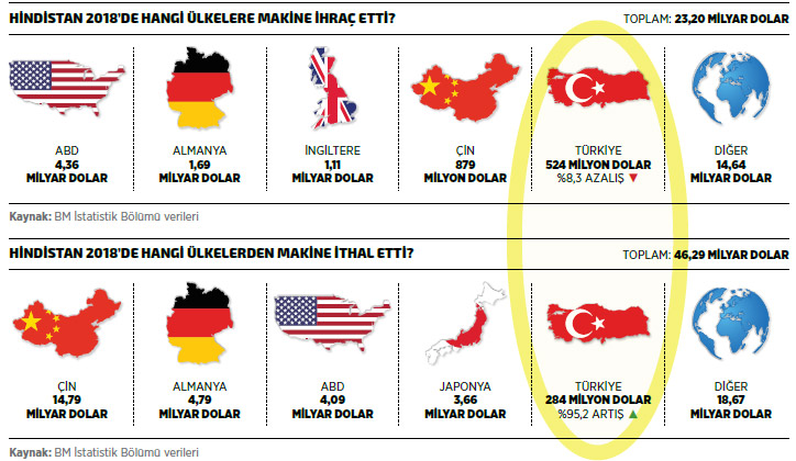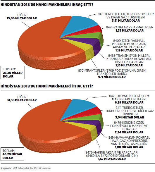 Diğer yandan, yükselen ekonomisi için makine ithalatına büyük pay ayırmaya devam eden Hindistan, 2018’de ihracatının iki katı değerinde makine ithal etti. BM İstatistik Bölümü verilerine göre Hindistan’ın sektör tamamı itibarıyla makine ithalatı 2018’de yüzde 20,2 artarak 46,29 milyar dolar seviyesinde gerçekleşti. 2018 yılı verilerine göre Hindistan’ın en fazla makine ithal ettiği ilk 10 ülke listesinin ilk sırasında yüzde 8,1’lik artış ve 14,79 milyar dolarla Çin yer alırken, listenin ikinci sırasında bulunan Almanya’dan yüzde 18,8 artışla 4,79 milyar dolar değerinde makine ithal edildi.