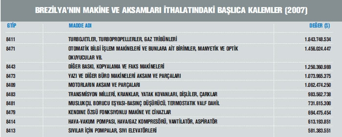 TÜİK verilerine göre Brezilya’ya yönelik olarak OAİB iştigal alanına; 84. fasılda olup, OAİB iştigal alanında bulunmayan GTİP’lerin eklenmesiyle oluşturulan makine sektörü toplamı ihracatı, 2008 yılı Ocak-Eylül döneminde bir önceki yıl eş dönemine göre yaklaşık yüzde 203 artarak 43 milyon dolara ulaşmış durumda. 2008 yılı ilk dokuz aylık dönemde Brezilya’ya yönelik makine sektör toplamı ihracatı nda, yaklaşık 21 milyon dolarlık ihracatı ile “ambalaj makineleri, aksam ve parçaları” mal grubunun ilk sırada yer aldığı görülüyor. 84. fasıl itibariyle sektör ihracatında önemli yer tutan kalemler ise dörtlü GTİP bazında incelendiğinde; 8462 nolu GTİP’de yer alan “Metalleri Dövme, İşleme, Kesme, Sataşama Presleri, Makineleri” nin ilk sırada yer aldığı ve ihracatı nın iki katından fazla artış gösterdiği görülüyor. 4. sırada yer alan ve ihracatı yüzde 409 artan “Pompalar ve AksamParçaları” ürün grubu ise Brezilya’ya makine ihracatımızda kayda değer artış gösteren bir kalem. Makine sektör toplamı itibariyle Türkiye’nin Brezilya’dan ithalatı, 2008 yılı Ocak-Eylül döneminde bir önceki yıl eş dönemine göre yüzde 4,5’lik artışla 127 milyon dolar olarak gerçekleşmiş. Brezilya’dan en fazla ithal edilen mal grubu, 35 milyon dolar ile “vanalar” olmuş. 2007 yılında Türkiye’nin Brezilya’dan 84. fasıl itibariyle en fazla ithal ettiği ürün grubu ise, 56 milyon dolar ile “Hava-Vakum Pompası, Hava/Gaz Kompresörü, Vantilatör, Aspiratör” olurken, onu 40 milyon dolar ile “Dozerler, Greyder, Skreyper, Ekskavatör, Küreyici, Yükleyici vb.” ürün grubu takip etmiş. Sektör ithalatında ilk beş kalem içerisinde en yüksek ithalat artışı ise yüzde 42,1 ile 8413 nolu GTİP’de yer alan pompalar ürün grubunda yaşanmış. SPOT: “ Türk işadamlarının Brezilya’yı daha iyi tanıyarak aktif bir şekilde konuya eğilmeleri, ülkeler arasındaki ticaret hacminin artmasında ve Türkiye açısından ekside olan dengenin düzeltilmesinde önemli rol oynayacağı düşünülüyor. Brezilya ile ülkemiz arasında kurulacak yakın ekonomik işbirliği, Arjantin, Paraguay, Uruguay ve Venezüella’nın üye oldukları geniş pazardan Türk firmalarının daha çok yararlanmasını sağlayacağı da kesin.”