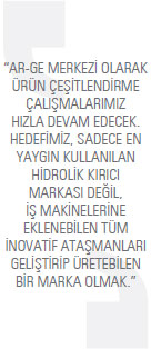 MTB markasıyla 2002 yılında hidrolik kırıcı üretimine başlamamızla birlikte yurt dışı pazarlardaki faaliyetlerimiz de giderek arttı. Almanya, ABD ve Fransa’da her yıl dönüşümlü olarak düzenlenen sektörümüzün küresel fuarlarında, MTB markasına sahip ürünlerimizi tanıtmaya başladık. Bu çalışmalar neticesinde de ihracatımız bugün itibarıyla üretimimizin yüzde 45’ine ulaştı. Dünya pazarlarındaki rekabet şartları, hem mevcut ürün yelpazemizi genişletmemizi hem de farklı ataşmanlar geliştirip imal etmemizi zorunlu hale getirdi. 2007 yılından bu yana dağınık bir şekilde yürütülen Ar-Ge çalışmalarımızı, şirket yönetimimizin desteğiyle Ar-Ge Merkezi çatısı altında kurumsallaştırdık. Bugüne kadar üçü TÜBİTAK destekli olmak üzere birçok projeyi hayat geçirdik. Bina yıkımında kullanılan üç farklı ataşman ürün ailesi (Crusher-Pulvarizer- Grapple), hafriyat ve peyzaj alanında kullanılan iki farklı ürün ailesi (Auger-Compactor), madencilik ve kaya zemini delme için kullanılan iki farklı ürün ailesi ve ekipmanla (Drifter-Delici Bit) birlikte kendi içinde çeşitlilik gösteren sekiz farklı ataşman geliştirip imal ettik. Dünya pazarlarında daha çok Almanya, Finlandiya, İsveç, İtalya, Güney Kore, Japonya ve Çin ile rekabet halindeyiz. Bu ülkelerin milli gelirinden Ar-Ge’ye ayırdıkları pay ise yüzde 2,2-4,1 arasında değişiyor. İleri teknolojili ürün ihracatının toplam ihracata oranı ise yüzde 16-25 arasında. Rakiplerimizin sadece bu ülkelerden olduğu ve orta teknolojili ürün sınıfındaki ürünlerle rekabet ettiğimiz bu ortamda, Ar-Ge merkezi olmanın bize kazandıracağı gücü kullanarak söz konusu ülkelerle rekabetimizi artırmaya ve alanında dünyanın en iyi markası olmaya çalışacağız.