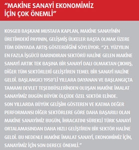 Mustafa Kaplan, makine sanayinin bir ülkenin gelişmişlik düzeyini belirleyen en önemli göstergelerden olduğunu söyledi. Kaplan: “Makine ya da makine imalat sanayi, bütün dünyada ülkelerin gelişmişlik düzeylerinin en önemli göstergelerinden biri olduğundan son derece özel bir öneme sahiptir.” Başkan Kaplan; makine sanayisinde faaliyet gösteren şirketlerin çoğunu büyük ve orta ölçekli KOBİ’lerin oluşturduğunun altını çizdi. Kaplan: Ayrıca makine sanayisinde faaliyette bulunan çoğu şirketin küçük ve orta ölçekli işletmelerden, KOBİ’lerden oluşması sektörü bizim için daha da özel hale getiriyor. Bu işletmelerimiz pek çok makine