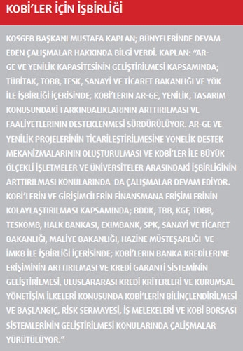 imalat sanayi KOBİ’lerine hizmet ve destekler vermekte idi. Geçtiğimiz yıl Mayıs ayında 3624 sayılı yasada değişiklik yapılarak hizmet ve ticaret sektörleri de hedef kitlemize dahil edildi. Bu KOSGEB’in kuruluşu kadar önemli bir gelişmedir. Böylece ekonomimiz içerisindeki yerleri ve istihdamdaki payları giderek artan hizmet ve ticaret sektörlerinin de KOSGEB tarafından desteklendiği yeni bir dönemin ilk adımı atılmış oldu. Ayrıca bu sayede KOBİ destek sisteminin ulusal çapta eşgüdümü sağlanmış oldu ve KOSGEB ülkemizin tüm KOBİ’lerinden sorumlu ulusal kuruluşu niteliğine kavuştu. Başkan Kaplan, proje sahibi meslek kuruluşlarına sundukları desteklere de değindi. Kaplan: “Yasal düzenlemenin ardından uygulayacağımız proje esaslı yeni destek sistematiğini de oluşturduk. Yeni destek programlarımızla katma değeri ve rekabet gücü yüksek, gelişme potansiyeli olan sektörlere öncelik veriyor, nitelikli KOBİ’lerin nitelikli şekilde desteklenmesini sağlıyoruz. Bu çerçevede işletmelere, girişimcilere, KOBİ’lere yönelik projeleri olan meslek kuruluşlarına ve işletici kuruluşlara, geri ödemeli ve geri ödemesiz olmak üzere;Ar-Ge, İnovasyon ve Endüstriyel Uygulama Destek Programı, KOBİ Proje Destek Programı, Tematik Proje Destek Programı, İşbirliği-Güç birliği Destek Programı, Girişimcilik Destek Programı ile Genel Destek Programı başlıkları altında destekler veriyoruz.”