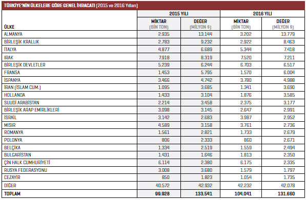 Hadde ve döküm makineleri mal grubunda 2016 yılının Ocak-Aralık döneminde 35 milyon dolarla en fazla Almanya’ya ihracat gerçekleştirildi. Listenin ikinci sırasında yer alan İtalya’ya 2015 yılının Ocak-Aralık döneminde 12,8 milyon dolarlık ihracat gerçekleştirilirken 2016 yılının aynı döneminde bu rakam yüzde 98,8 artışla 25,6 milyon dolar olarak kayda geçti. Üçüncü sıradaki Bulgaristan’a 2016 yılının Ocak-Aralık döneminde 19,9 milyon dolar değerinde ürün ihraç edildi. 2015 yılında bu rakam 8,3 milyon dolardı. Bulgaristan’a yönelik ihracat artışı yüzde 138,8 oldu. Dördüncü sırada bulunan İran’a 2016 yılının Ocak-Aralık döneminde 18,9 milyon dolarlık ihracat gerçekleştirildi. Listenin beşinci sırasındaki Rusya’ya 2016 yılının Ocak-Aralık döneminde 17,3 milyon dolar değerinde hadde ve döküm makineleri ihraç edildi.
